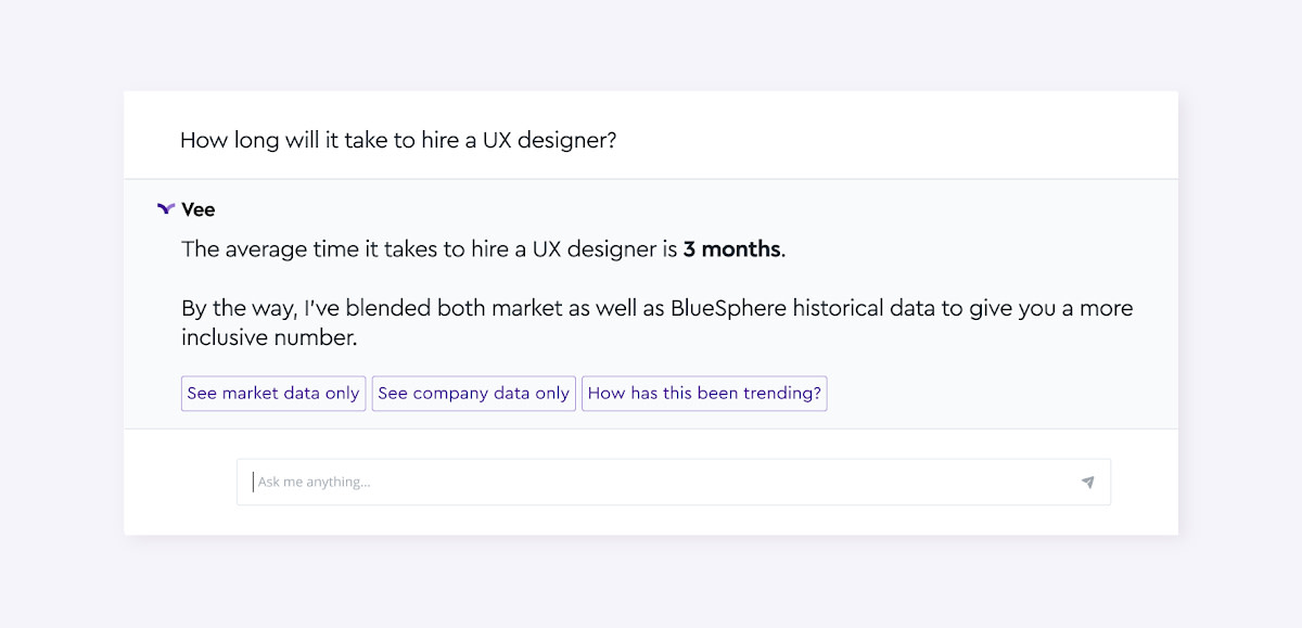 Ask Vee any question about your workforce and Vee will provide the answers in simple narrative form.