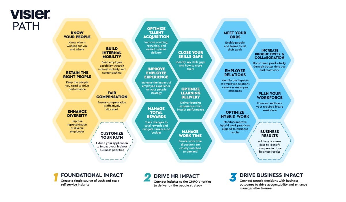 The Visier Path is arranged from left to right in order of increasing level of impact on the business. The Foundational Impact zone is about aligning on a single place where HR leaders, HRBPs, and managers can answer their people questions. The Drive HR Impact zone helps you target specific HR jobs to be done that are likely to be part of the CHRO’s agenda. Finally, the Drive Business Impact zone focuses on org-wide challenges that will directly affect the business’s financial performance.